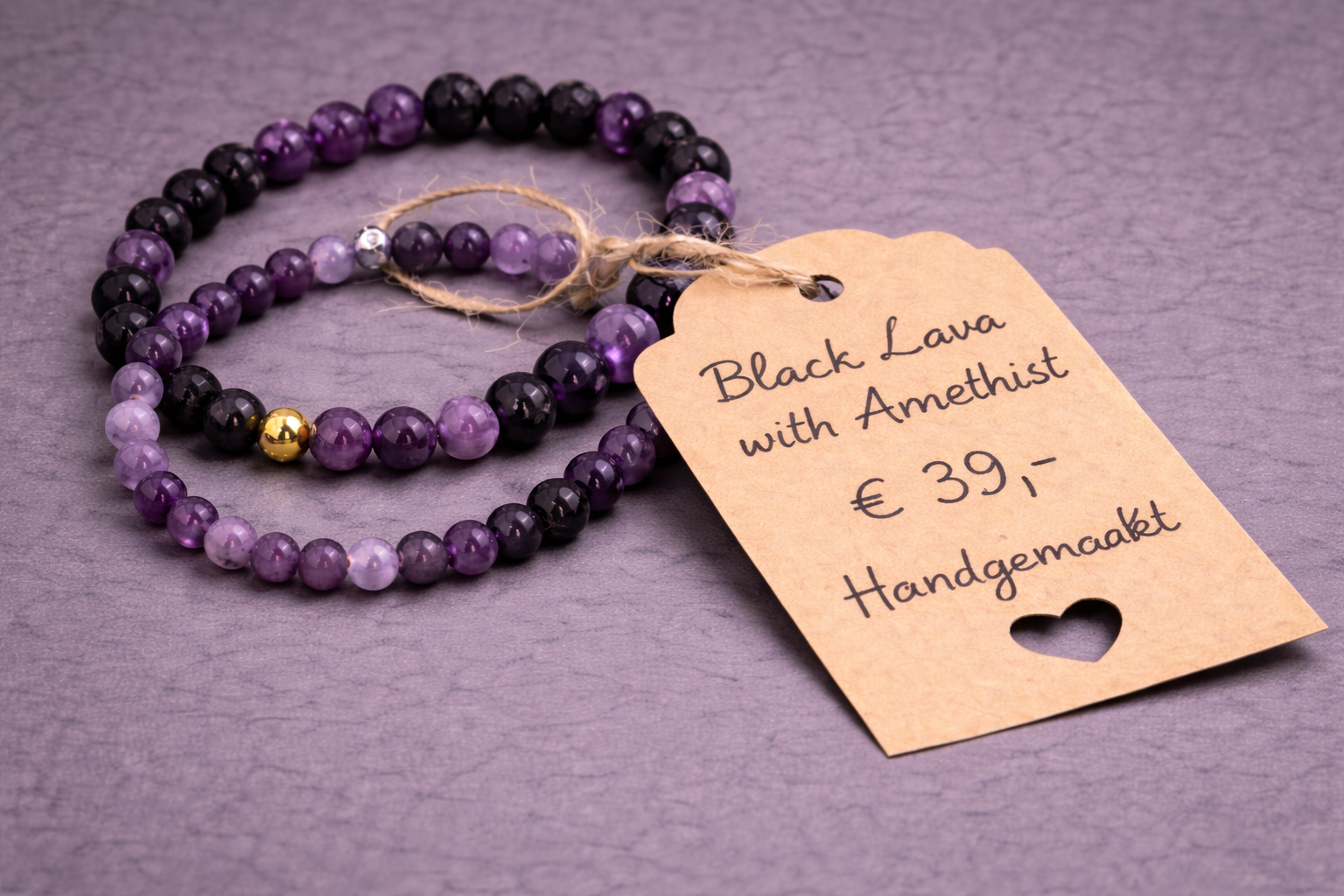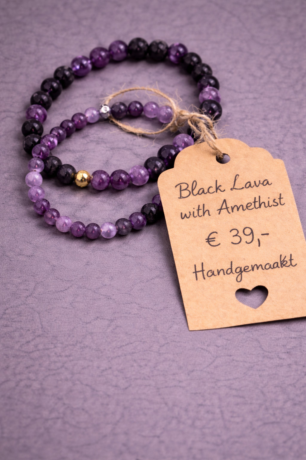 Deze armbanden combineren de kalmerende energie van amethist met de aardende kracht van zwarte lavasteen. Amethist helpt om je hoofd tot rust te brengen en helderheid te creëren, terwijl lava je stabiliteit en kracht geeft.
