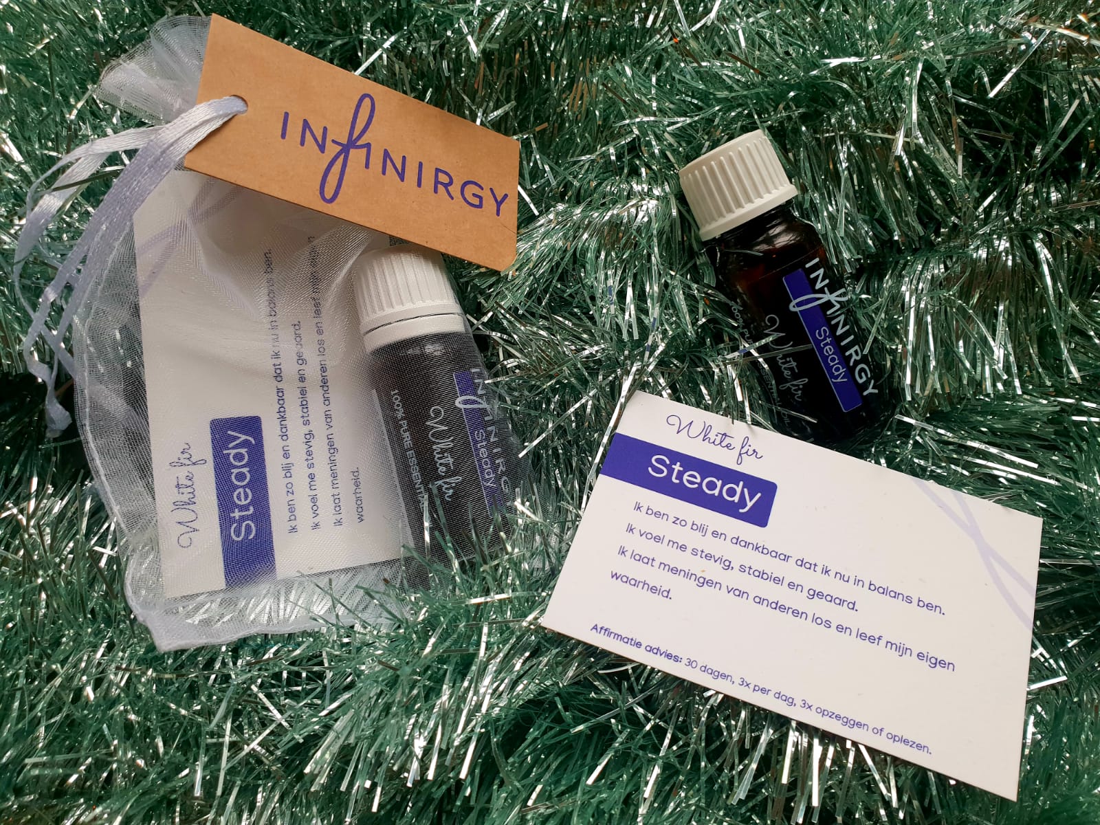 Elke olie is met liefde en aandacht verpakt in een transparant organza zakje, affirmatiekaartje en Infinirgy kraft kaartje.
