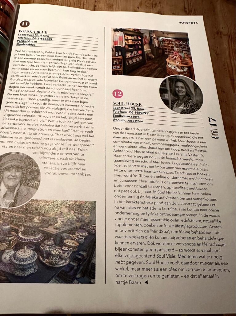 Onder die schilderachtige rieten kapjes aan het begin van de Laanstraat in Baarn is een plek gecreëerd die net even anders is dan een gewone winkel. Soul House is een combinatie van winkel, ontmoetingsplek, workshopruimte en werkruimte. Alles draait hier om body, mind en lifestyle.
